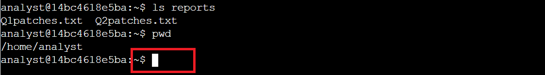Pro Tip: To learn what your username is, use the whoami command. The whoami command returns the username of the current user. For example, if your username is analyst, entering whoami returns analyst.