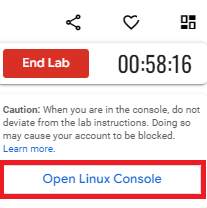 After you click Start Lab, the lab control dialog box opens. It contains the End Lab button, the timer, and the Open Linux Console button.