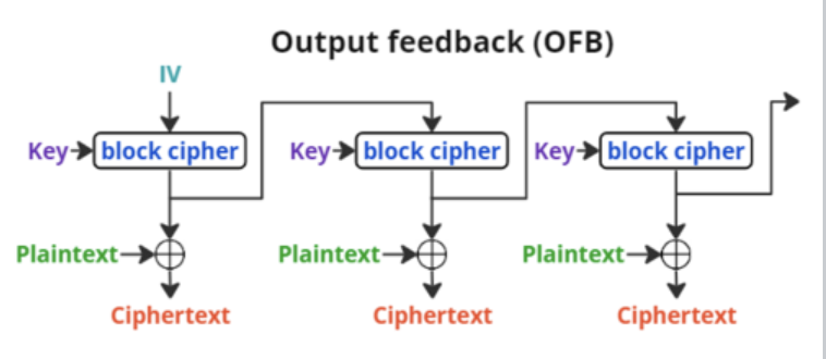 출력 피드백(OFB, Output FeedBack) 모드에서는 CBF와 동일하게 스트림 암호화 방식으로 암호화가 이루어진다. 다른 점은 암호화 시 생성된 이전 암호문 블록이 사용되는 CFB와 달 리, 초기에 생성된 암호문 블록이 계속 사용된다. 이렇게 이전 암호문 블록이 현재 암호화 에 연결되지 않기 때문에, 오류 전파 방지가 가능하다는 장점이 있다. 즉, 어느 한 블록에서 오류가 생겨도 다음 블록으로 전파되지 않는다. 또한 각 블록이 독립적이기 때문에 앞의 두 모드와 달리 병렬 처리가 가능해 빠르다는 것 역시 또다른 장점이다. 하지만 동일한 초 기화 백터(IV)를 사용하고, 동일한 평문 블록에 대해 같은 암호문 블록이 생성되어 패턴 분 석 및 유출이 가능하기에 보안이 취약하다는 단점이 존재한다.