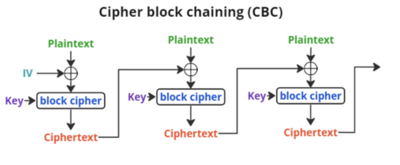 * IV: Initialization Vector(IV)는 블록 암호화에서 사용되는 보조 입력 값으로, 이름에서 알 수 있듯 블록 암호화에서 사용되는 키와 함께 암호화 프로세스를 초기화한다. IV의 작업을 통해 암호화에 사용되는 블록들의 패턴이 반복되지 않도록 하여 최종적으로는 보안성이 향상된다.